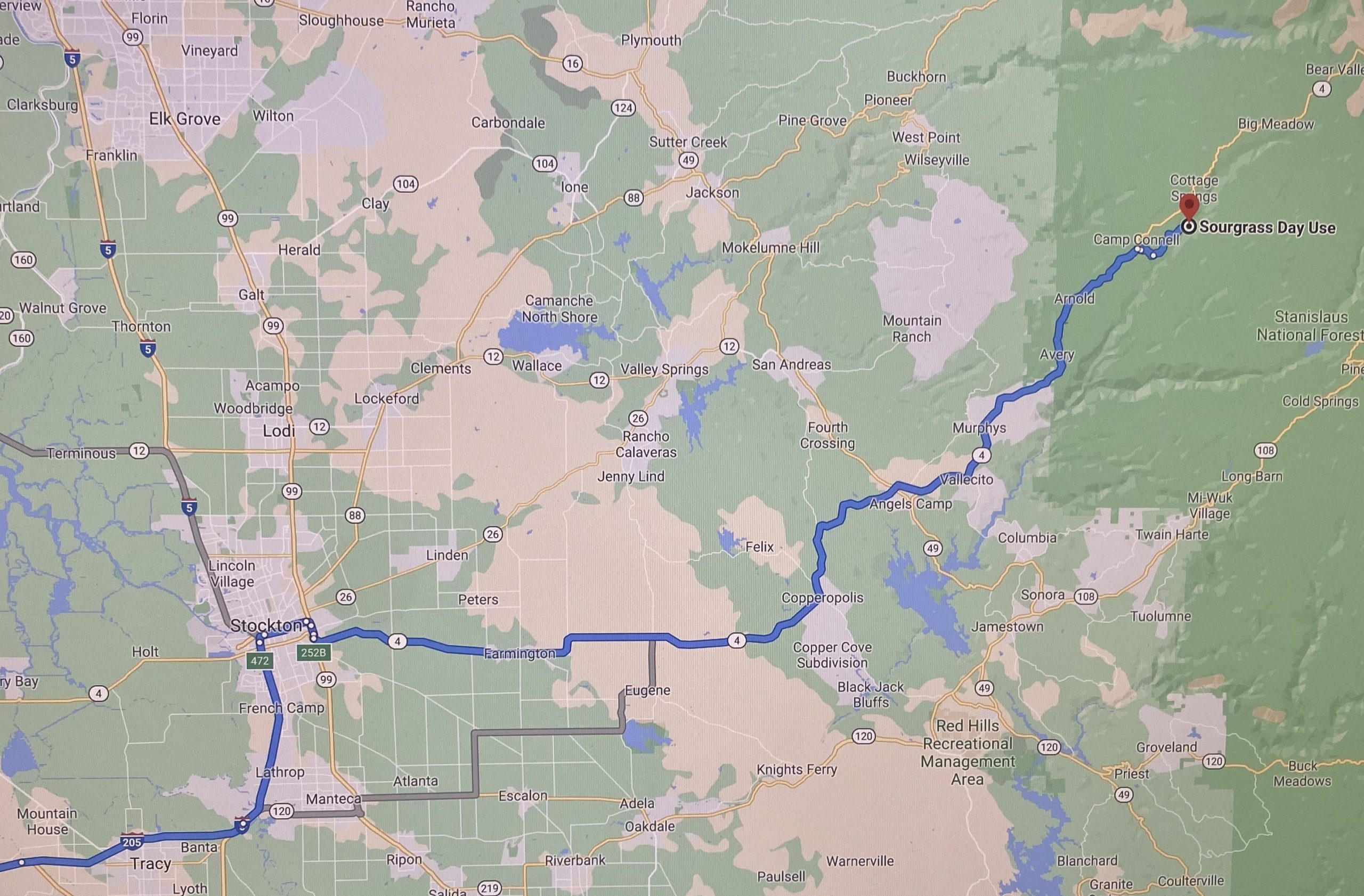 How to Get There: Set your navigation system to “Sourgrass Day Use” outside of Arnold, CA, or alternatively the “Wakalu Hep Yo” Campground. Both take you east on Highway 4 through Stockton and up into the foothills through Copperopolis (I just like saying that city name), Murphys, and Arnold.